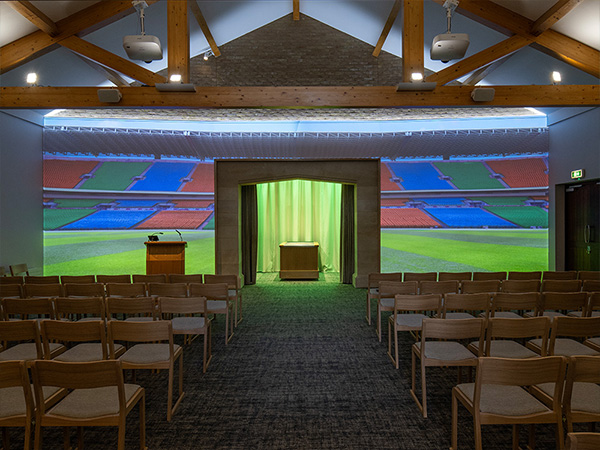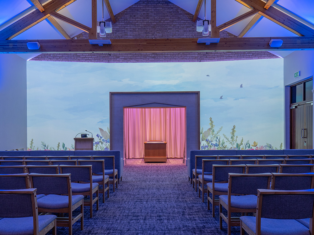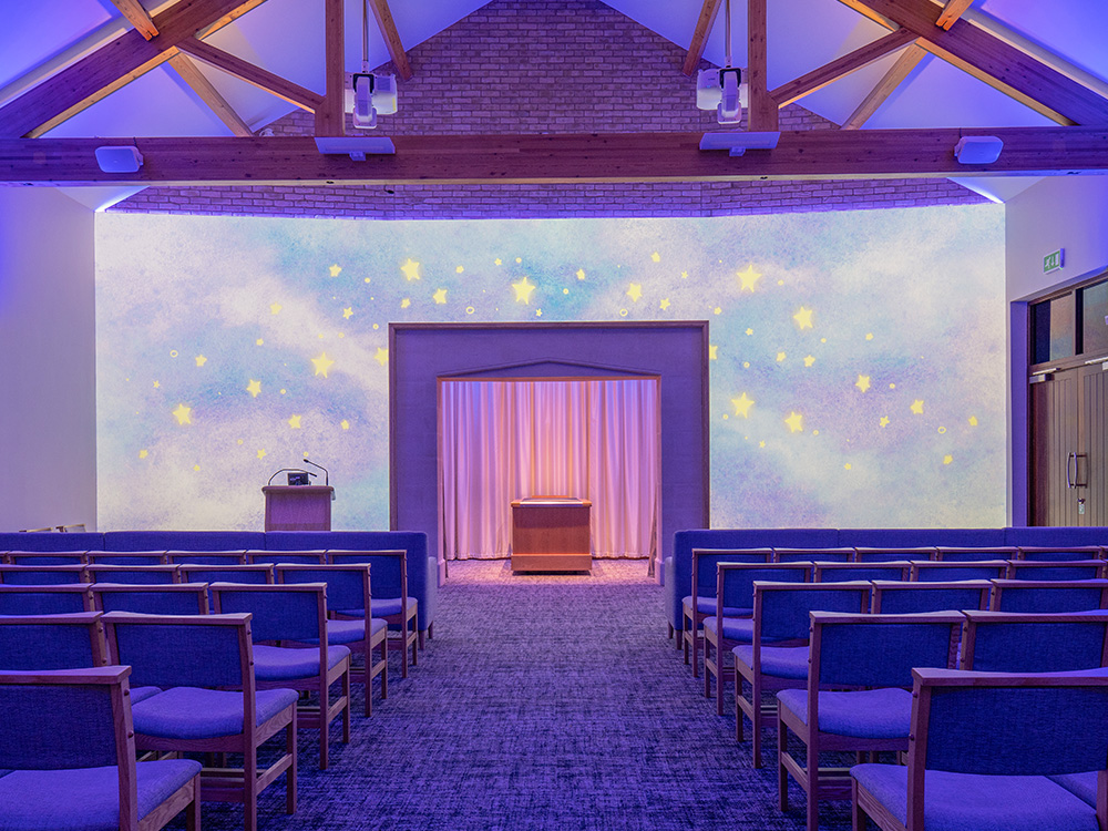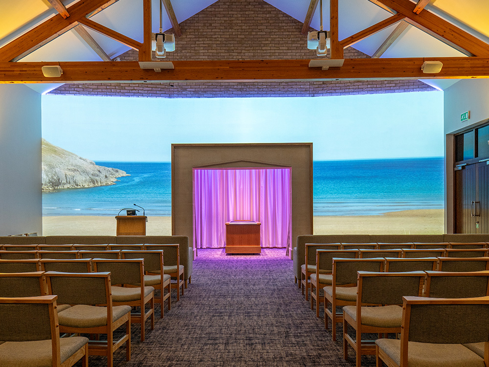 Our state-of-the-art media technology is able to transform the entire wall space around the catafalque into a themed backdrop (Canvas). High-spec audio equipment and customisable lighting enable families to enhance the canvas projections with carefully curated accompanying music and lighting, tailoring the whole chapel to reflect the life of the loved one being remembered.