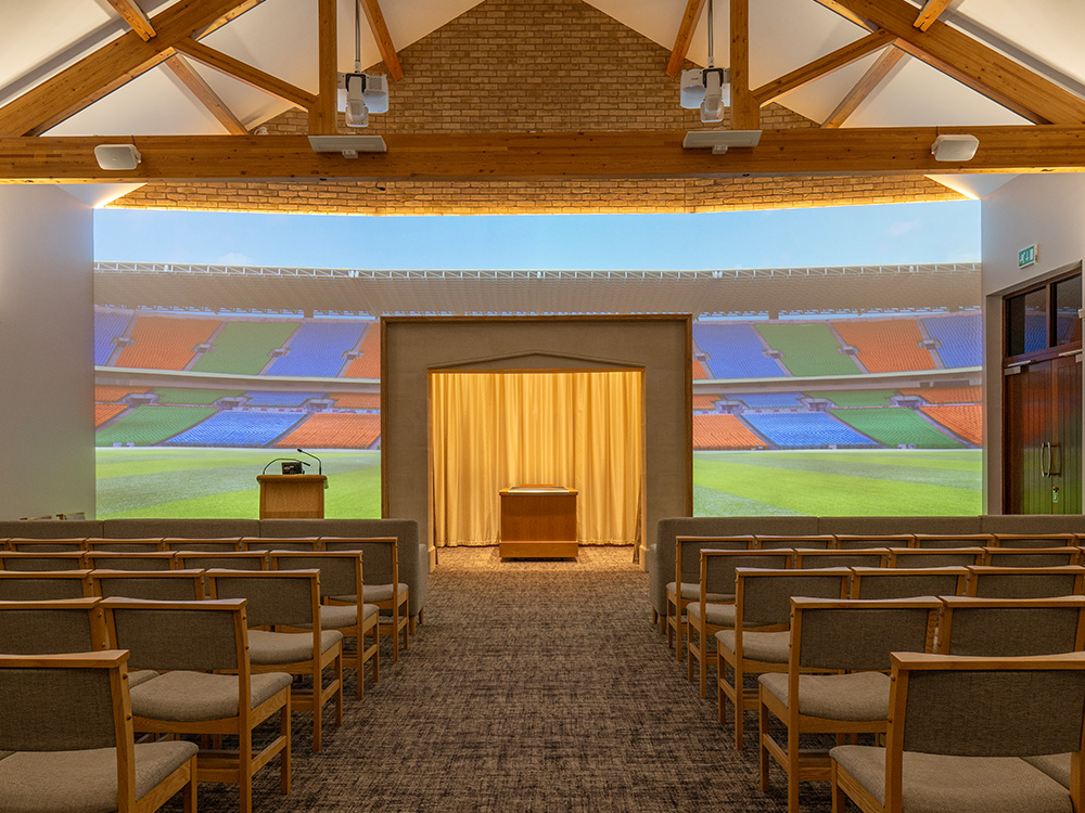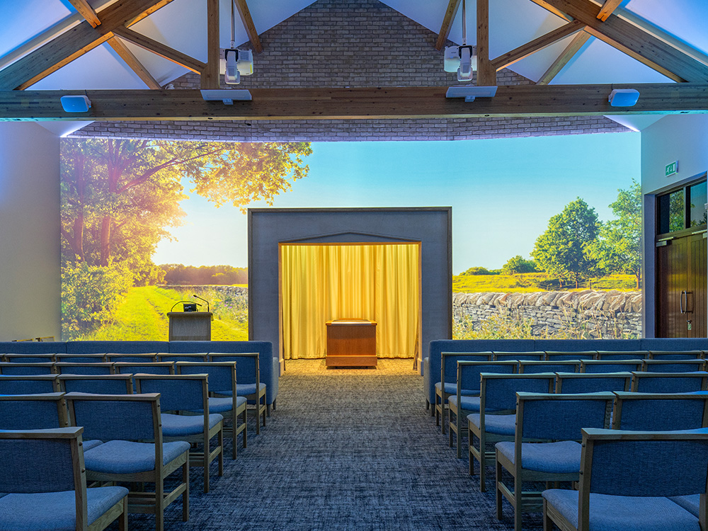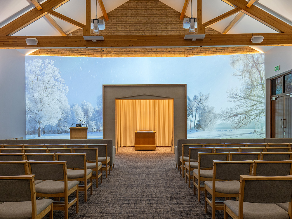 Where other UK venues can only provide visual tributes and photos of a loved one on chapel screens, our canvas wall serves as the entire visual tribute backdrop for a service.