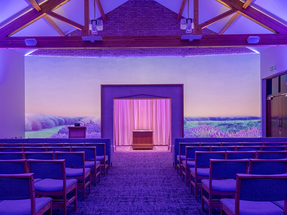 Our chapel can host religious and non-religious traditional services and all above mentioned features can be switched off to facilitate a simpler, traditional service.